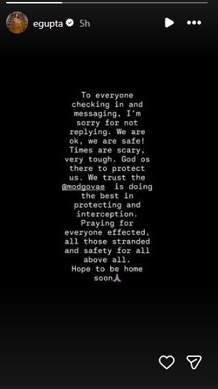 Hoping to be back in India soon, Esha on Instagram Story wrote, “To everyone checking in and messaging, I’m sorry for not replying. We are ok, we are safe! Times are scary, very tough. God is there to protect us. We trust the @modgovae is doing the best in protecting and interception.”