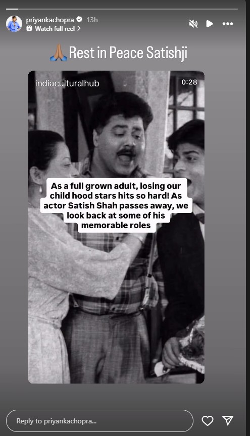 Taking to her Instagram stories, Priyanka Chopra Jonas re-shared a post by India Cultural Hub. She wrote, “Rest in Peace, Satishji.”
