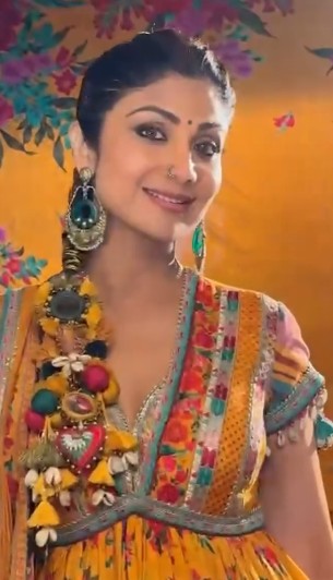 Shilpa Shetty Kundra is famously known for bringing Bappa home every year during the festival. In one of her looks, the actress chose a yellow-printed traditional kurta set, with a deep V-neckline and colourful floral motifs all over it. Shilpa paired her kurta with matching sharara pants and dupatta, further accessorising it with oxidised jewellery, silver bangles, bracelets, and more.