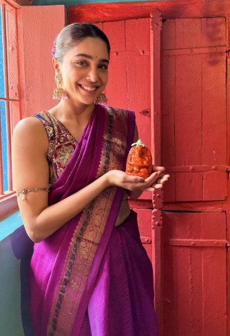 When talking about Ganesh Chaturthi outfits, one can never miss the traditional Nauvari saree. Famously worn by the women in Maharashtra, these sarees are considered an authentic choice for the festival. Shraddha Kapoor, who is known for taking part in the festivities every year with her family, chose a beautiful red Nauvari saree. She completed her look with simple jewellery and makeup.