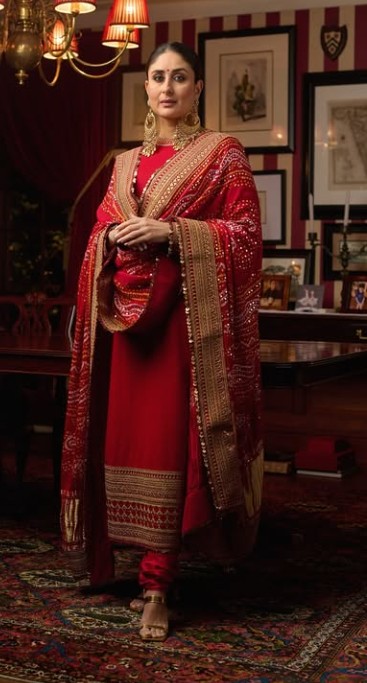 The Bollywood diva, known for her impeccable fashion sense, stole the show with her regal Sabyasachi red suit set at Ganesh Chaturthi celebrations. Kareena styled her plain red suit with a beautiful dupatta adorned with intricate prints and gota. She further added large chandelier earrings to enhance her look.