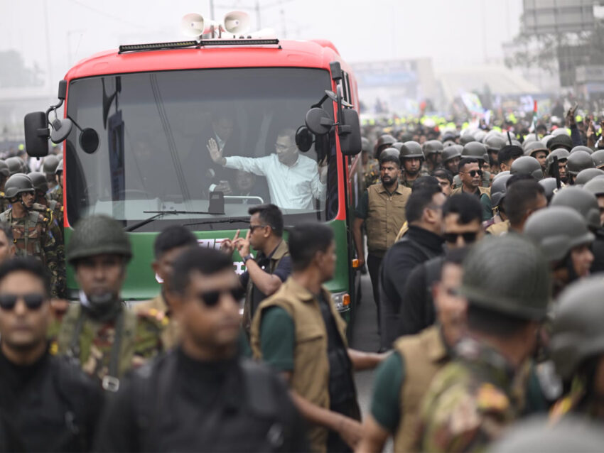 Amid tight security arrangements, thousands of BNP supporters lined along key roads, including the area near Hazrat Shahjalal International Airport and the 300 Feet Road, to welcome the party’s acting chief aboard a bus adorned in the party’s colours.
