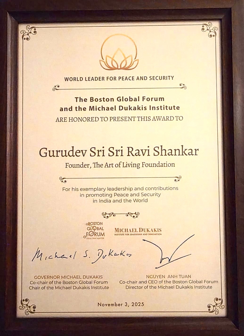 The Boston Global Forum lauded Gurudev for making peace a lived experience rather than an abstract concept. Through The Art of Living Foundation, he has taught practical techniques such as SKY Breath Meditation (Sudarshan Kriya), which reduce stress, heal trauma and foster emotional resilience — vital foundations for peace-building.