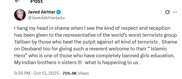 Mumbai (Maharashtra) [India], October 14 (ANI): Veteran lyricist Javed Akhtar, known for his outspoken political views, expressed his dismay over the “reverent” reception extended to Afghan Foreign Minister and senior Taliban leader Amir Khan Muttaqi during his visit to Darul Uloom Deoband in Saharanpur, Uttar Pradesh.