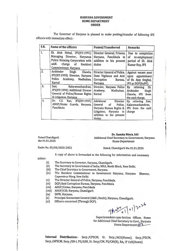 In another significant move, Arshinder Singh Chawla, IPS (HY:1993), who was serving as Director, Haryana at Karnal, has been posted as Director General of Police, State Vigilance and Anti-Corruption Bureau, against a vacant post.