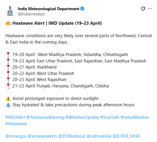 Several regions across Northwest, Central, and East India are set to experience intense heatwave conditions over the next few days, the India Meteorological Department (IMD) announced on Monday. The spike in mercury is expected to impact states including Rajasthan, Madhya Pradesh, and Uttar Pradesh starting April 20.