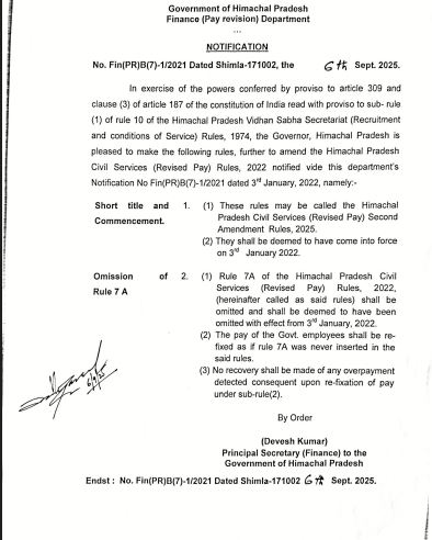 In a notification issued by the Finance (Pay Revision) Department, the government said the Himachal Pradesh Civil Services (Revised Pay) Second Amendment Rules, 2025, will be deemed effective from January 3, 2022.