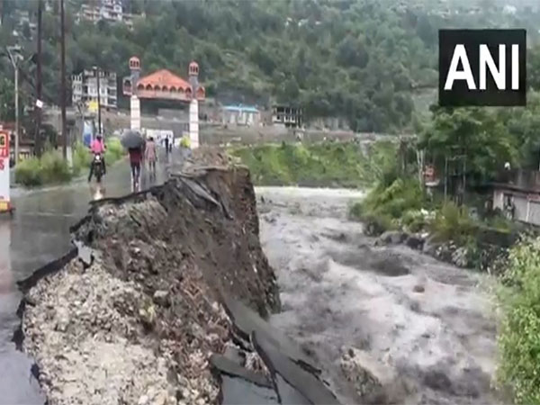 Kullu (Himachal Pradesh) [India], August 19 (ANI): A portion of the road near the Bhoothnath bridge in Himachal Pradesh’s Kullu district was damaged on Tuesday due to heavy rainfall and the rising water level in the Beas river.