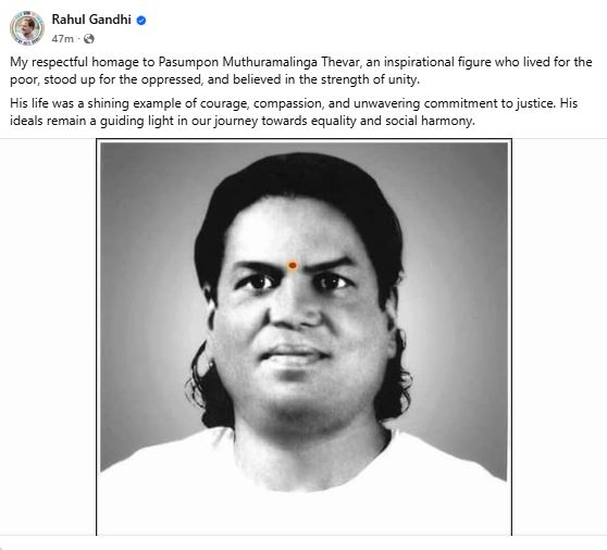 In a post on Facebook, Gandhi wrote, “My respectful homage to Pasumpon Muthuramalinga Thevar, an inspirational figure who lived for the poor, stood up for the oppressed, and believed in the strength of unity. His life was a shining example of courage, compassion, and unwavering commitment to justice. His ideals remain a guiding light in our journey towards equality and social harmony.