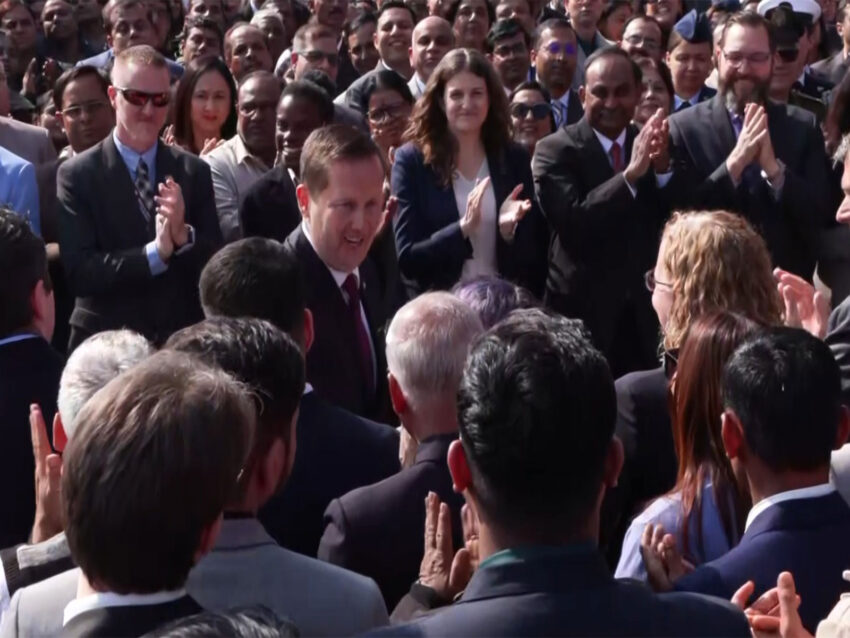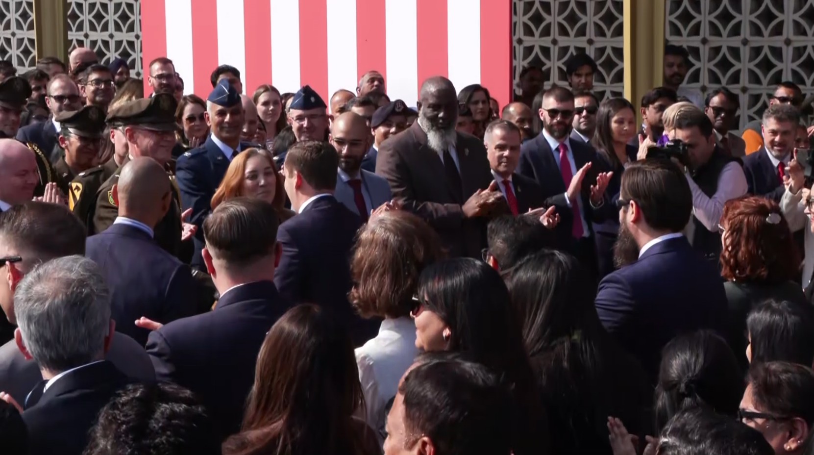 As Gor walked up to the podium to take the oath, the popular song “Hold On, I’m Comin'” by Sam & Dave played in the background. Those present at the Embassy cheered as he approached the stage.