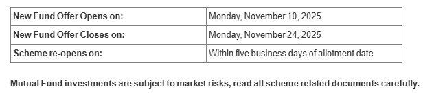 The New Fund Offer opens on Monday, November 10, 2025, and closes on Monday, November 24, 2025. The scheme reopens for subscription within five business days from the date of allotment.