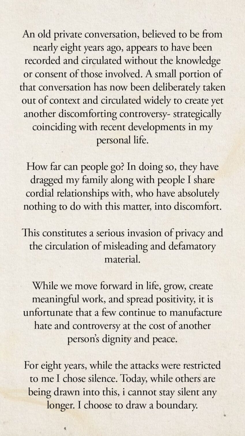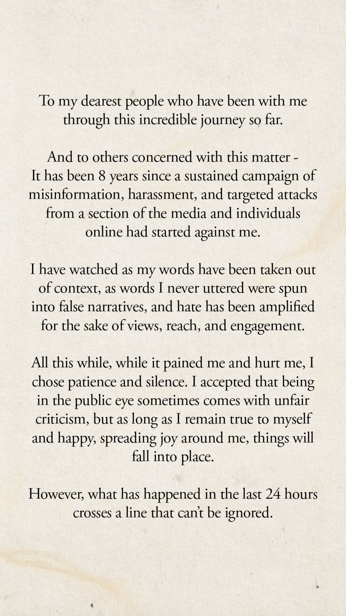 While the actor said she had chosen patience and silence despite the pain it caused, the events of the last 24 hours crossed a line she could no longer ignore. She also expressed disappointment that the controversy has caused unnecessary discomfort for her family and those close to her, even though they have no connection to the matter.