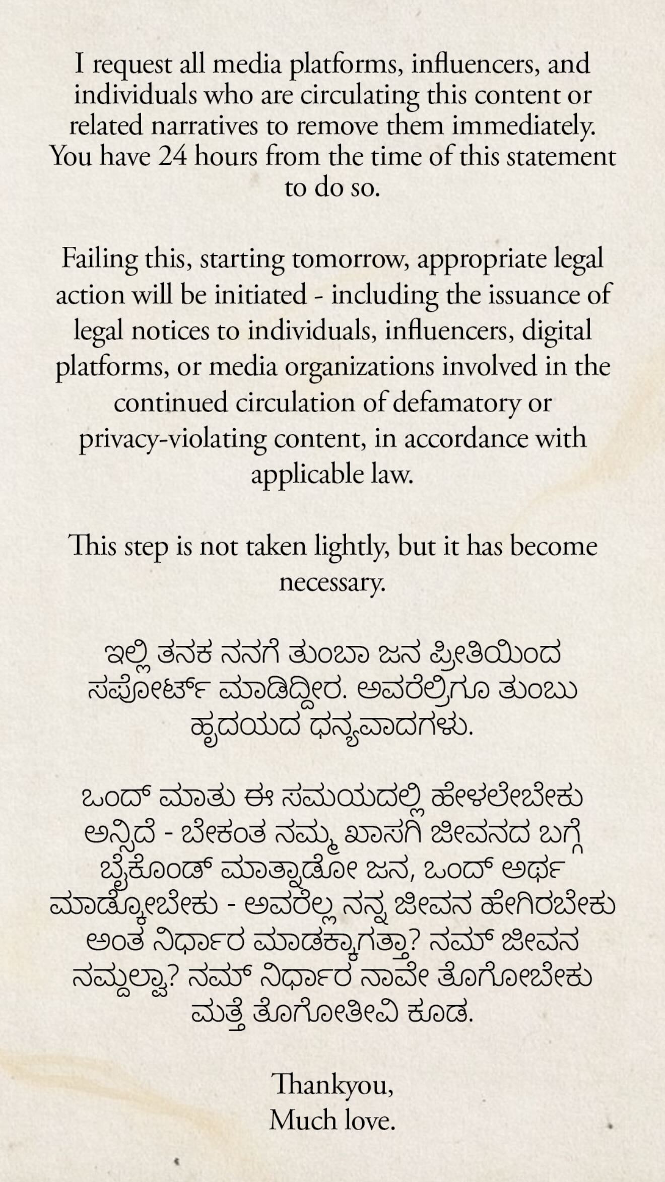 Calling the circulation of the clip “misleading and defamatory”, Rashmika requested media platforms, influencers, and individuals sharing the content to remove it immediately. She also stated that those circulating the material have been given a 24-hour window, failing which legal action will be initiated.