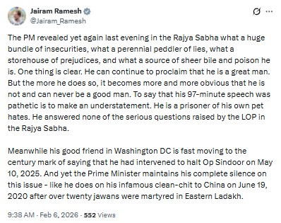 In a post on X, Ramesh described the Prime Minister’s address as a “huge bundle of insecurities and a perennial peddler of lies.”