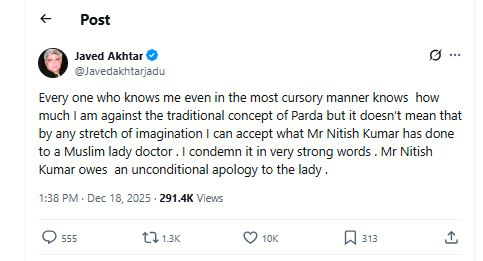Akhtar, who has often spoken publicly about his opposition to the traditional practice of purdah, made it clear that his personal views do not justify interfering with a woman’s choice or dignity. Reacting to the video, Akhtar wrote, “Everyone who knows me, even in the most cursory manner, knows how much I am against the traditional concept of purdah. But that doesn’t mean, by any stretch of the imagination, that I can accept what Mr. Nitish Kumar has done to a Muslim lady doctor. I condemn it in the strongest possible terms. Mr. Nitish Kumar owes an unconditional apology to the lady.”