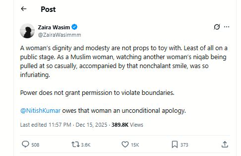 Her post read, “A woman’s dignity and modesty are not props to toy with. Least of all on a public stage. As a Muslim woman, watching another woman’s niqab being pulled at so casually, accompanied by that nonchalant smile, was so infuriating. Power does not grant permission to violate boundaries. @NitishKumar owes that woman an unconditional apology.” (ANI)