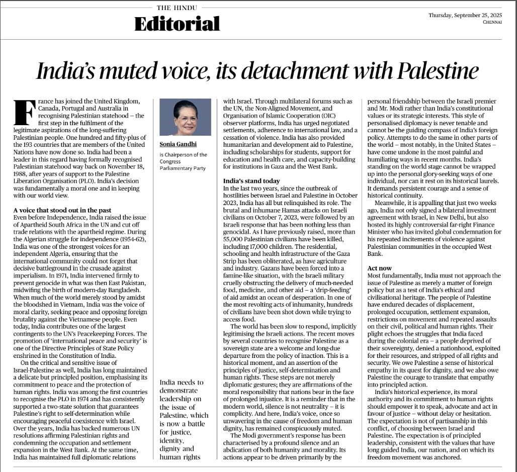 In the op-ed piece in The Hindu titled ‘India’s muted voice, its detachment with Palestine’, Sonia Gandhi stated that India needs to demonstrate leadership on the issue of Palestine.
