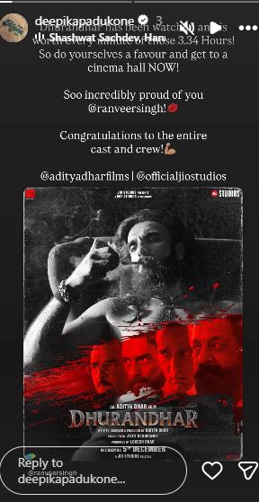 “Dhurandhar has been watched and is worth every minute of those 3.36 hours. So do yourself a favour and get to the cinema hall now! Soo incredibly proud of you ©ranveersingh! Congratulations to the entire cast and crew! @adityadharfilms | Cofficialjiostudios,” she posted.