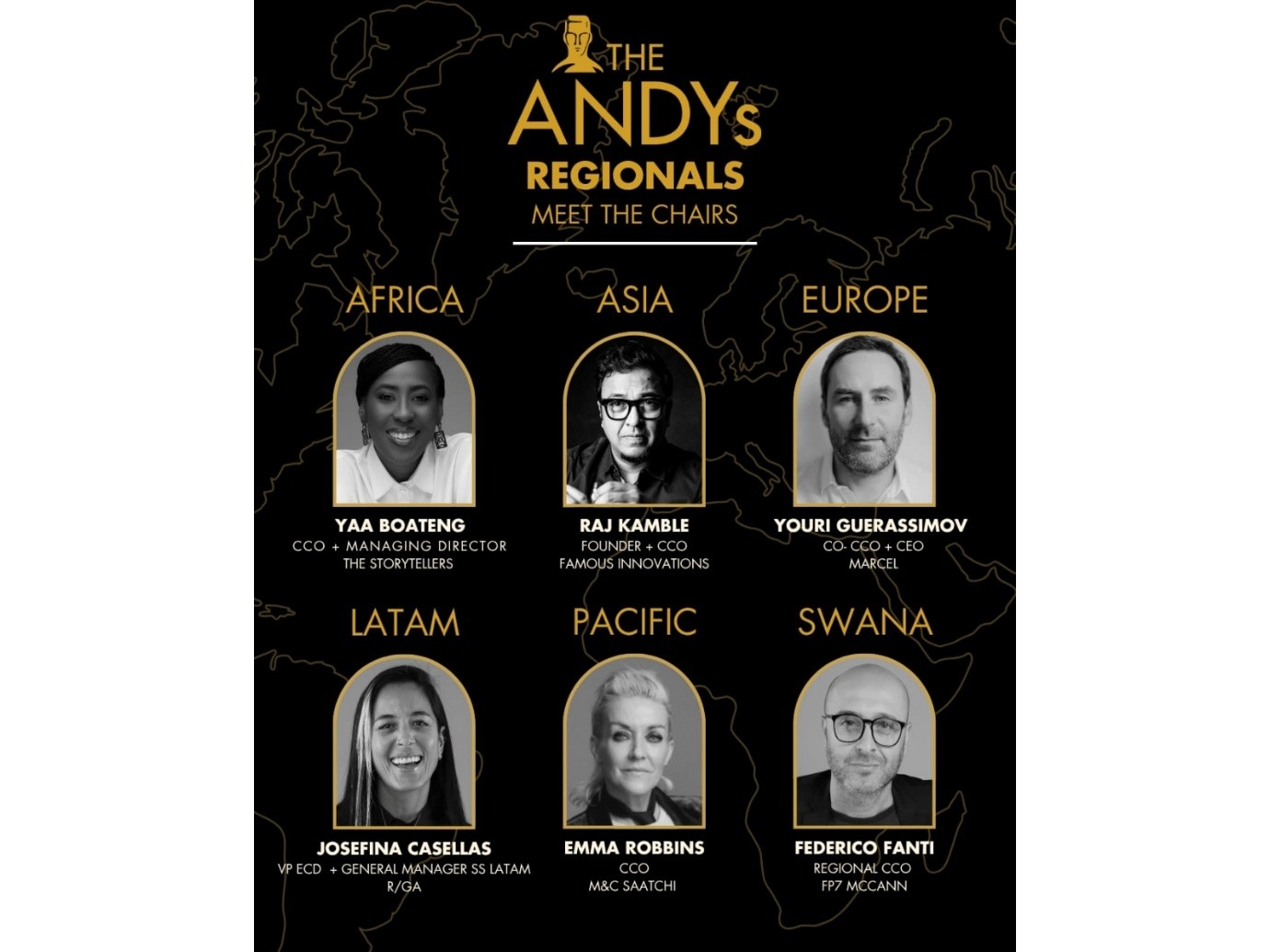 Joining him on the global slate of Regionals Chairs are: Yaa Boateng – CCO & Managing Director, The Storytellers (Africa), Youri Guerassimov – Co-CCO & CEO, Marcel (Europe), Josefina Casellas – VP ECD & General Manager SS LATAM, R/GA (LATAM), Emma Robbins – CCO, M&C Saatchi (Pacific) & Federico Fanti – Regional CCO, FP7 McCann (SWANA)