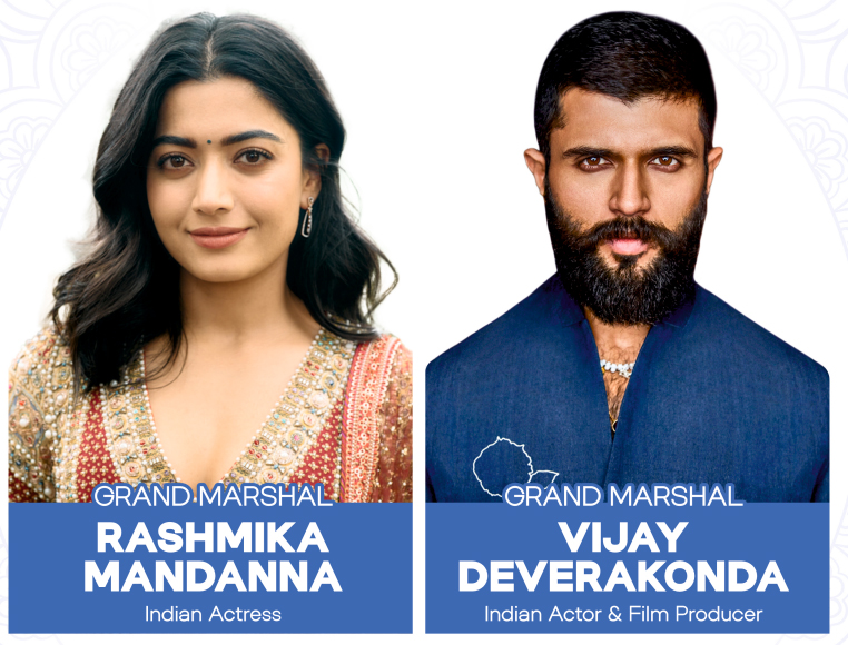 Massive LED displays showed Indian film superstars Vijay Deverakonda and Rashmika Mandanna, widely known as India’s “National Crush,” greeted the audience in pre-recorded message given in six languages—Hindi, Telugu, Tamil, Kannada, Malayalam, and English. They would be leading the IDY as Co-Grand Marshals as it vended its way down Madison Avenue, and in celebrations related to it. They ended their messages with the slogan “Jai Hind!”