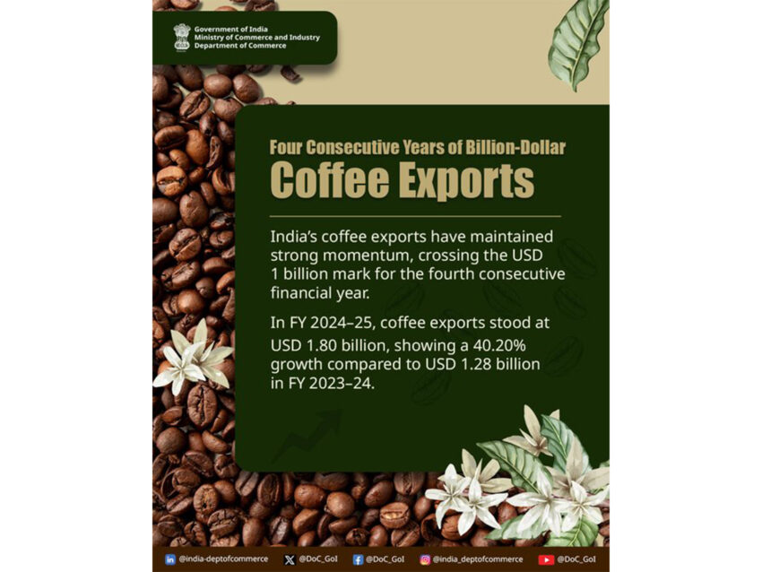 During the financial year 2024-25, India’s coffee exports reached USD 1.80 billion, marking a 40.2 per cent growth over the USD 1.28 billion achieved in FY 2023-24, the department said in a X post, attached with it an infographic.