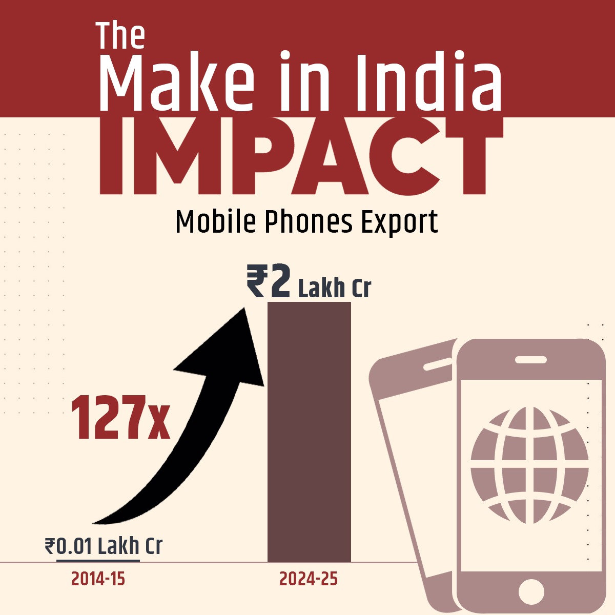 Mobile phone production rose from Rs 0.18 lakh crore to Rs 5.5 lakh crore, while its exports rose from negligible Rs 0.01 lakh crore to Rs 2 lakh crore, reflecting the ‘Make in India’ initiative.