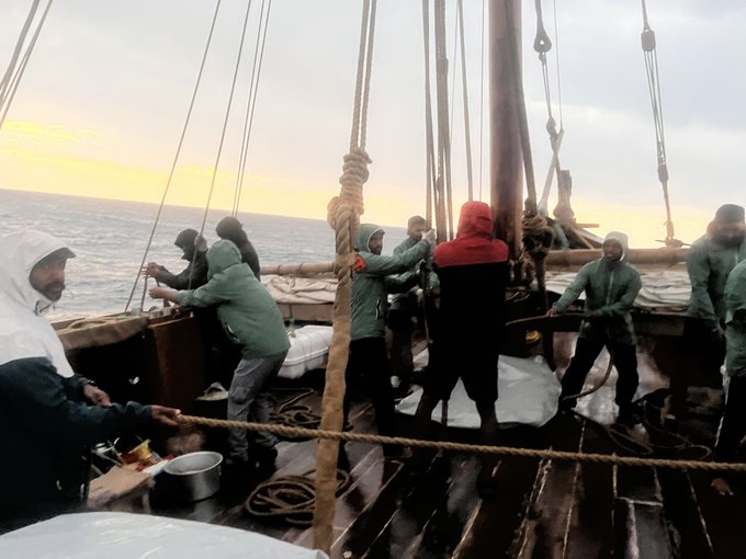 “Everything is damp after that. Also the local system disrupted the wind but it is now back from the east. We did however get a nice sunset. It was still drizzling when we raised the sails. Now more than 2/3 done. We will soon face a problem the ancient mariners did not face – oil tankers and large container vessels. So far we we encountered the occasional one, but tomorrow we will enter a heavy traffic corridor.” Sanyal posted on X.