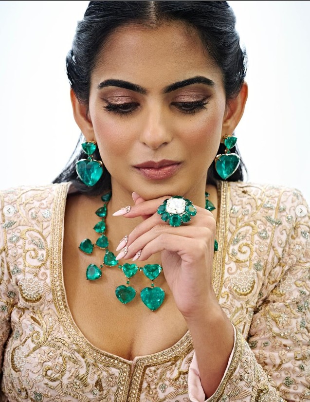 Isha complemented her look with emerald jewels from her mother’s collection, including a statement necklace, earrings, and a ring.