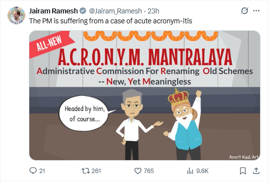Post the passage of the bill, he shared a cartoon on X that said: “All new A.C.R.O.N.Y.M MANTRALAYA – Administrative Commission For Renewing Old Names – New Yet Meaningless.” He captioned the post saying, “The PM is suffering from a case of acute acronoym-itis.”