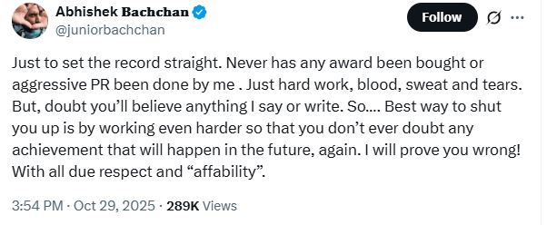 “Never has any award been bought or aggressive PR been done by me . Just hard work, blood, sweat and tears. But, doubt you’ll believe anything I say or write. So…. Best way to shut you up is by working even harder so that you don’t ever doubt any achievement that will happen in the future, again. I will prove you wrong! With all due respect and affability,” Abhishek responded.
