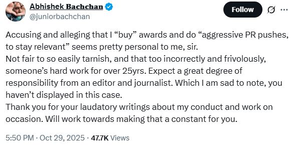 In response to an X user who claimed that Abhishek Bachchan engaged in “aggressive PR pushes” and bought his recent Filmfare Award, the actor did make sure to set the record straight.