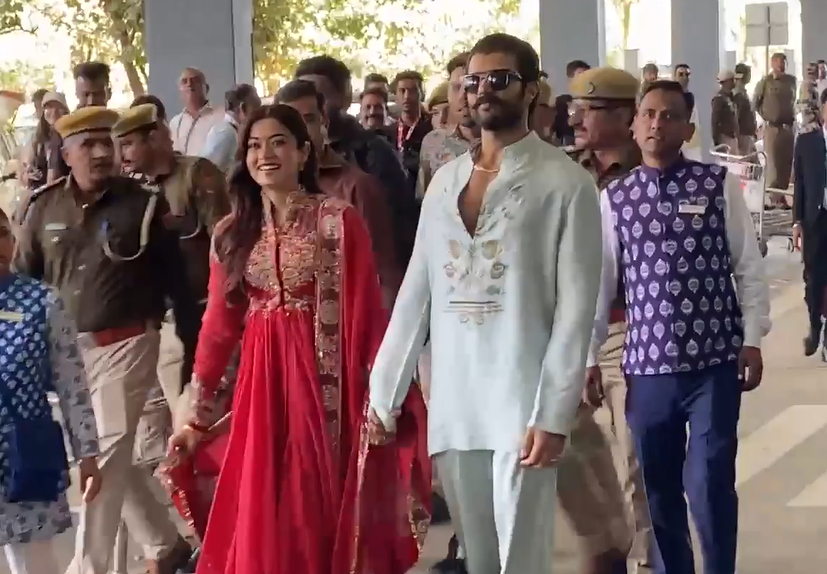 Udaipur (Rajasthan) [India], February 27 (ANI) Newlyweds Vijay Deverakonda and Rashmika Mandanna arrived at the Udaipur Airport on Friday for a meet and greet session with their fans.