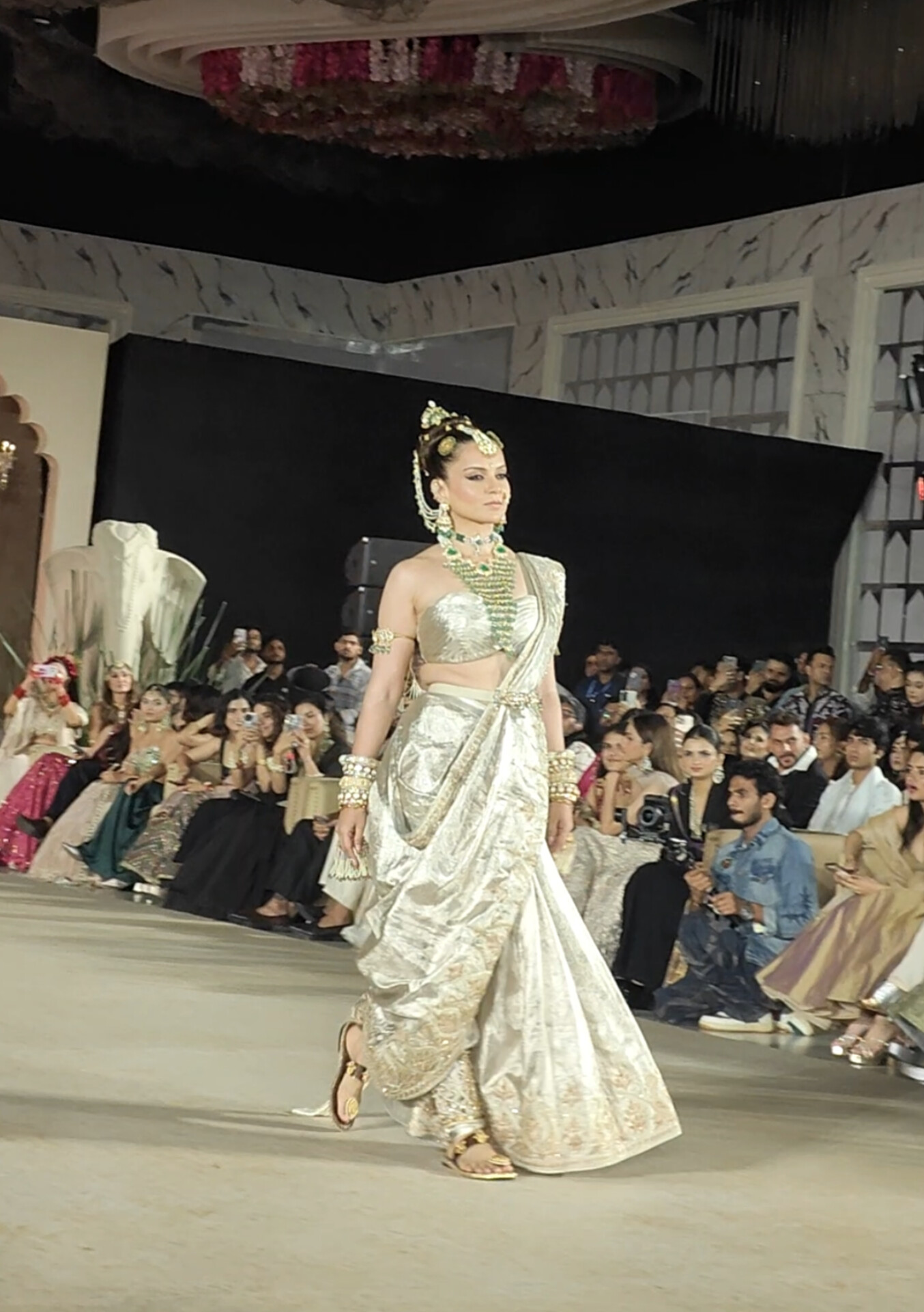 The ‘Queen’ actor walked the ramp in a stunning ivory outfit paired with an ornate emerald and gold jewellery set, finishing her look with a flower-adorned bun and traditional accessories, giving her an aura of timeless royalty.