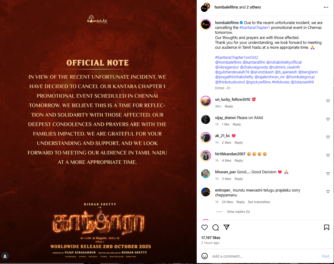 “In view of the recent unfortunate incident, we have decided to cancel our Kantara Chapter 1 promotional event scheduled in Chennai tomorrow. We believe this is a time for reflection and solidarity with those affected. our deepest condolences and prayers are with the families impacted. We are grateful for your understanding and support, and we look forward to meeting our audience in Tamil Nadu at a more appropriate time,” the statement read.