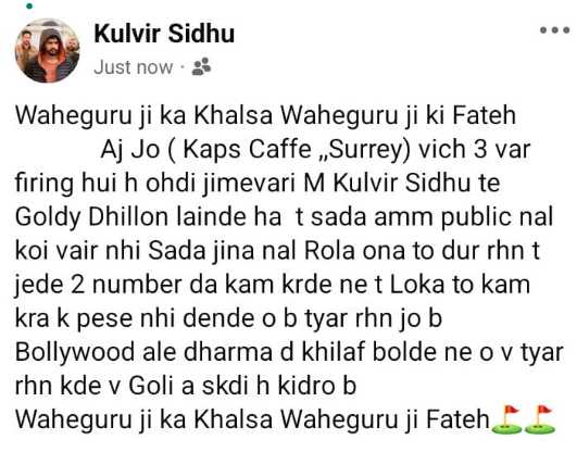 “Waheguru Ji Ka Khalsa, Waheguru Ji Ki Fateh. Today’s firing at Caps Cafe, Surrey, was carried out by me, Kulvir Sidhu, and Goldy Dhillon. We hold no grudge against the general public. Those who owe us or cheat us will be warned. Bollywood individuals who speak against our religion should also be prepared, bullets can come from anywhere.”