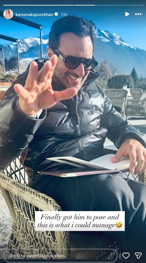 On Tuesday, Kareena posted a picture of her husband, actor Saif Ali Khan, enjoying a snowy day. The photo showed Saif sitting on a cable chair with snow all around him. He looked calm and happy as he made a victory sign with his fingers against the white background.
