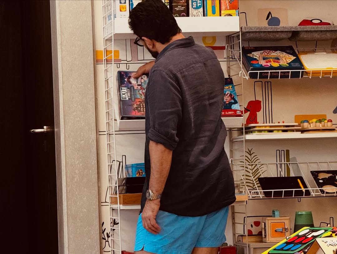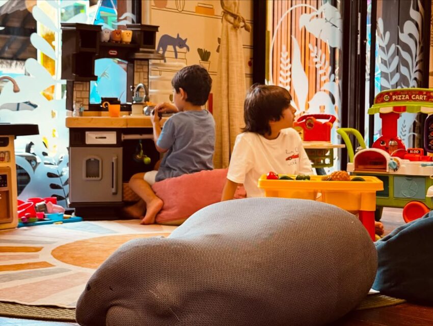 Kareena shared a selfie from a playroom, followed by pictures of her sons deeply engaged in fun activities. The final slide featured her husband, actor Saif Ali Khan, browsing the room for board games.