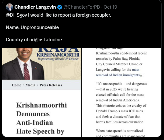 October 22, 2025, SCHAUMBURG, IL – After Florida politician Chandler Langevin—who recently called for the mass deportation of Indian Americans—attacked Congressman Raja Krishnamoorthi’s name and heritage, calling him a “foreign occupier” in response to the Congressman’s earlier condemnation of his racist comments, Congressman Krishnamoorthi issued the following statement: