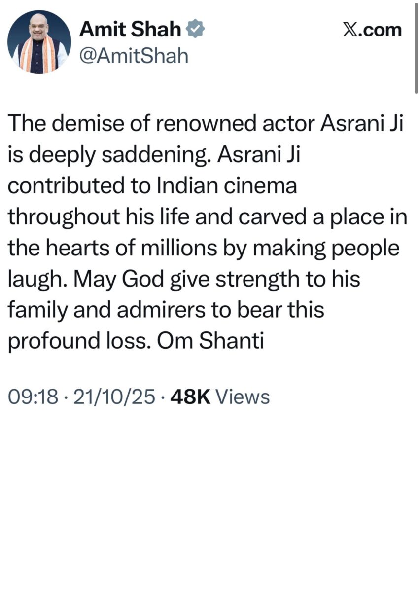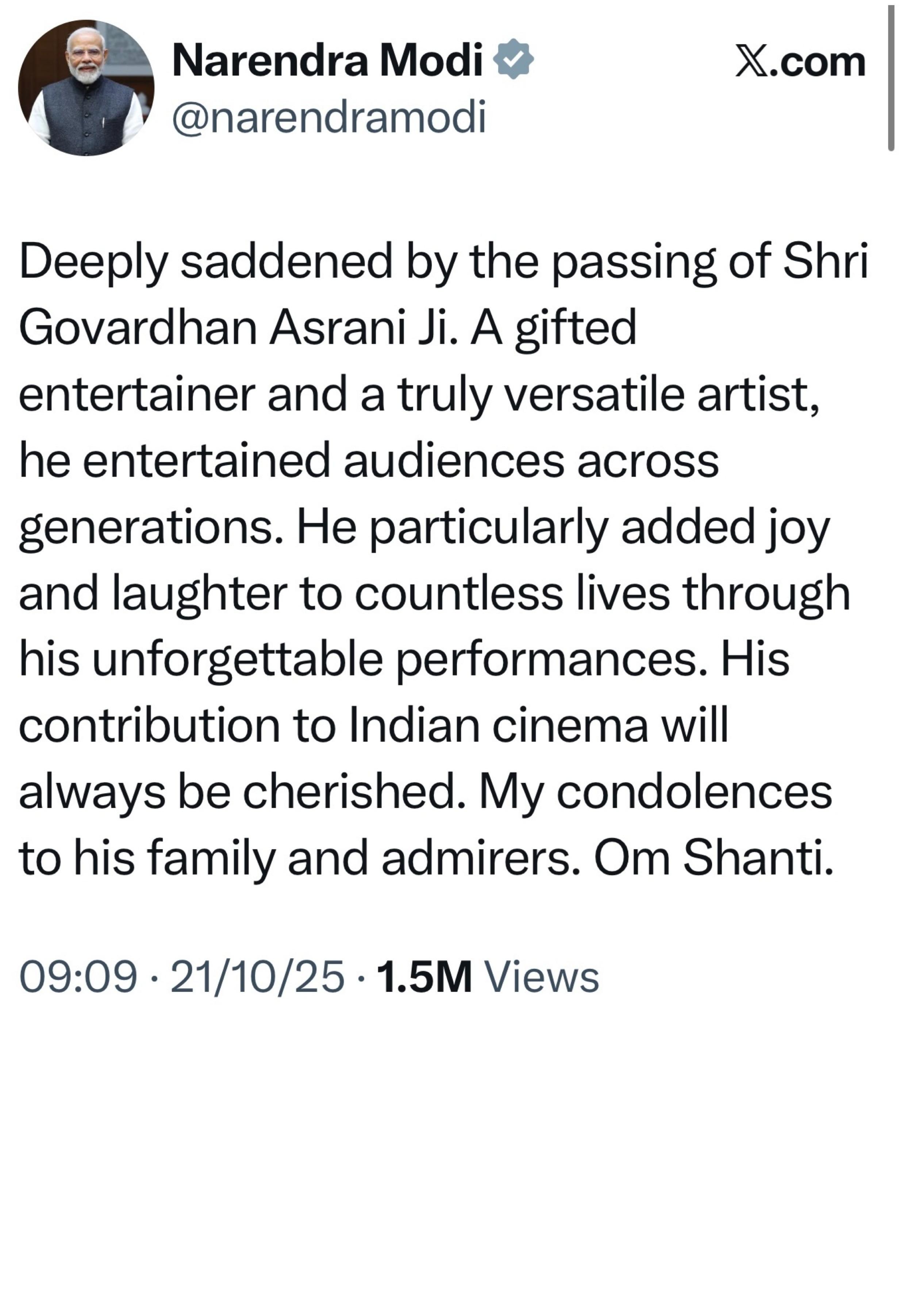 In an X post, PM Modi wrote, “Deeply saddened by the passing of Shri Govardhan Asrani Ji. A gifted entertainer and a truly versatile artist, he entertained audiences across generations. He particularly added joy and laughter to countless lives through his unforgettable performances.”