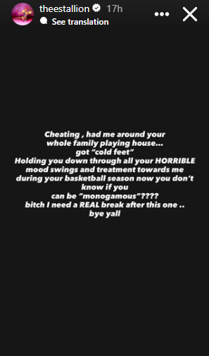 “Cheating, had me around your whole family playing house… got “cold feet”. Holding you down through all your HORRIBLE mood swings and treatment towards me during your basketball season now you don’t know if you can be “monogamous”???? bitch I need a REAL break after this one.. bye yall,” Megan wrote.