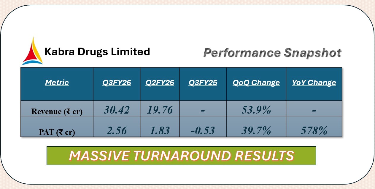 Chennai (Tamil Nadu) [India], February 17: PAT rose 578% compared to last year as Kabra Drugs Limited (BSE: 524322), a fast-emerging microcap company, announced its unaudited financial results for the quarter ended December 31, 2025, on February 13, 2026, alongside a series of strategic initiatives approved earlier on January 1, 2026. Together, these milestones underscore the Company’s turnaround momentum, its diversification into high-growth industries, and the strong investor rally that has driven its stock up nearly 200% over the past year.