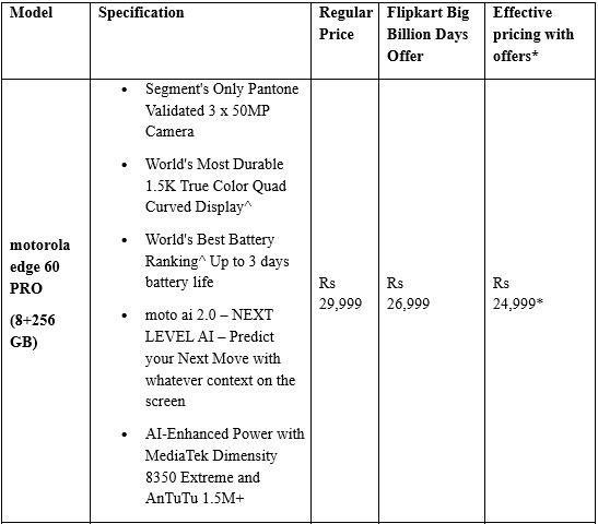 New Delhi [India], October 6: Motorola, a global leader in mobile technology and India’s most trusted AI smartphone brand, has announced blockbuster festive discounts on its most popular smartphones across price segments, exclusively for Flipkart’s Big Billion Days Sale 2025. As part of the #BigBillionMotoRush, Motorola is bringing its latest innovations in AI, Pantone™ design, and durability to millions of consumers at never-before prices. The products are live for sale starting 4th October, 00:00 hrs, and will be available to all customers throughout the Big Billion Days.