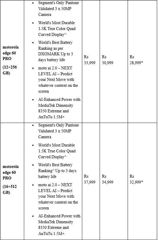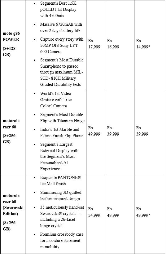 The edge 60 PRO debuts the segment’s only Pantone™ validated triple 50MP camera system, including a Sony LYTIA 700C main camera, 50MP ultrawide + macro, and 10MP telephoto with 3X optical and 50X AI Super Zoom. Enhanced by motoAI, Google Gemini, Microsoft Copilot, and Perplexity integration, the camera delivers professional-grade shots and 4K videos with AI-driven stabilization, AI photo enhancer, and Google Photos tools like Magic Eraser and Unblur. The edge 60 PRO also features the world’s most durable 6.7″ 1.5K True Colour Quad-Curved Display with 4500nits peak brightness, HDR10+, and Gorilla Glass 7i protection. It runs on the MediaTek Dimensity 8350 Extreme chipset with up to 16GB LPDDR5X RAM, backed by a massive 6000mAh DXOMARK Gold-rated battery supporting 90W TurboPower™ charging, 15W wireless charging, and reverse charging. Built to last, the device comes with IP68/IP69 protection and MIL-STD-810H certification. The motorola edge 60 PRO is available in four striking Pantone finishes – Dazzling Blue (fabric), Walnut (wood), Shadow, and Sparkling Grape (vegan leather). Other festive prices include Rs 28,999* for 12+256GB* and Rs 32,999* for 16+512GB* instead of Rs 33,999 and Rs 37,999.