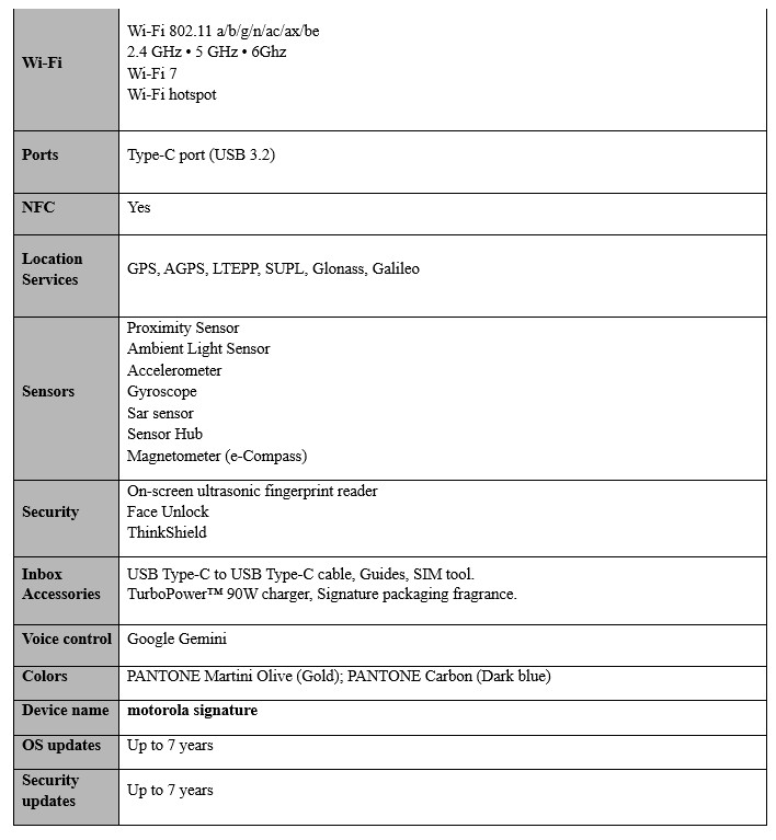 The motorola signature runs on Hello UI based on Android 16, with 7 assured OS upgrades and 7 years of security maintenance releases (SMR), delivering a secure and future-ready experience. It features Moto Secure 5.0 with ThinkShield for business-grade protection, Family Spaces to manage app access and usage for others, and Moto Unplugged to help users disconnect from digital distractions. Complementing the software are eco-friendly packaging and Moto EliteCare, offering premium support, including free standby devices during repair, free pickup and drop, a dedicated Signature Buddy, and 24×7 WhatsApp assistance, ensuring a seamless and elevated ownership experience.