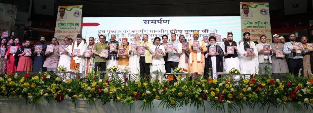 In his keynote address, MRM Chief Patron Indresh Kumar emphasised unity against terrorism as “pure satanism” beyond caste, religion, or colour and drug addiction, declaring, “We were, we are, and we will always remain Hindustani,” which drew thunderous applause, reinforcing pride in a shared Indian identity.