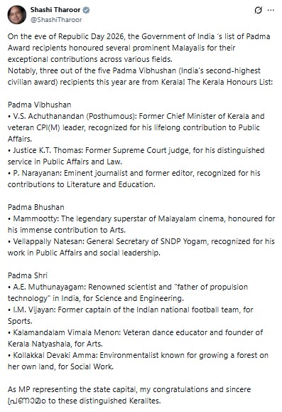 Listing the awardees, Tharoor wrote, “On the eve of Republic Day 2026, the Government of India’s list of Padma Award recipients honoured several prominent Malayalis for their exceptional contributions across various fields.”