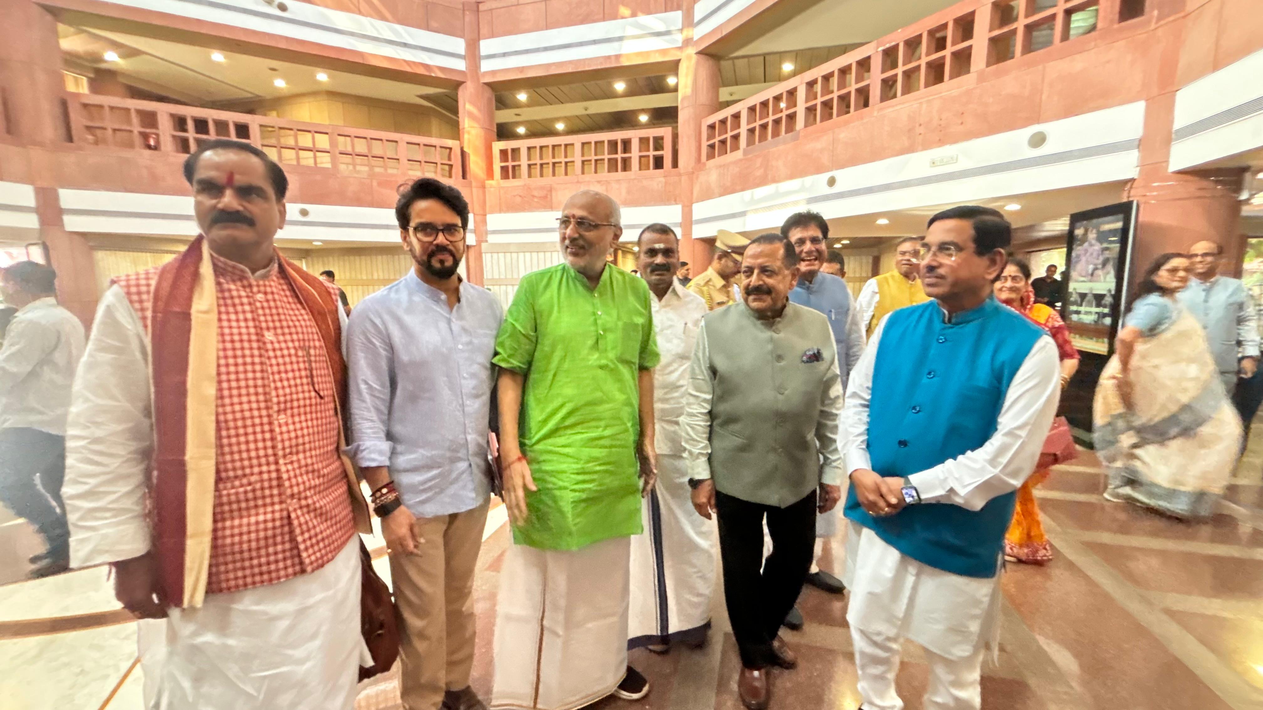 Radkhakrishnan also arrived at the Parliament library building, being greeted by Union Minister Piyush Goyal and other leaders ahead of the meeting.