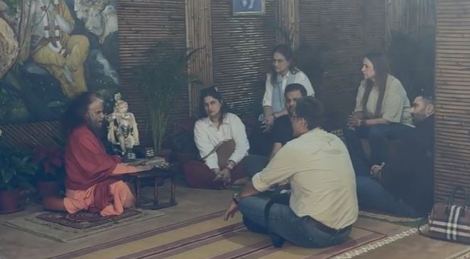 Visuals from the ashram show the late actor’s son, Nikitin Dheer, along with the others in a deep conversation with spiritual guru Swami Chidanand Saraswati.