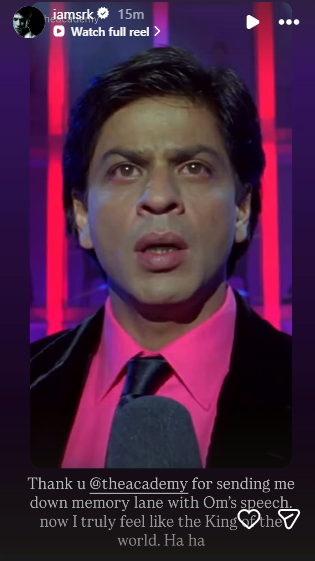 Taking to his Instagram story, SRK reshared the Academy’s post and reacted with his signature wit and much gratitude.