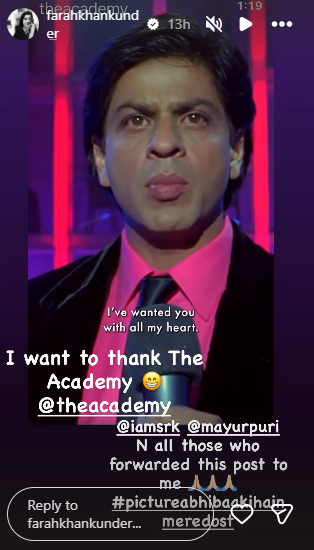 “I want to thank The Academy @theacademy @iamsrk @mayurpuri N all those who forwarded this post to me #pictureabhibaakihainmeredost.”